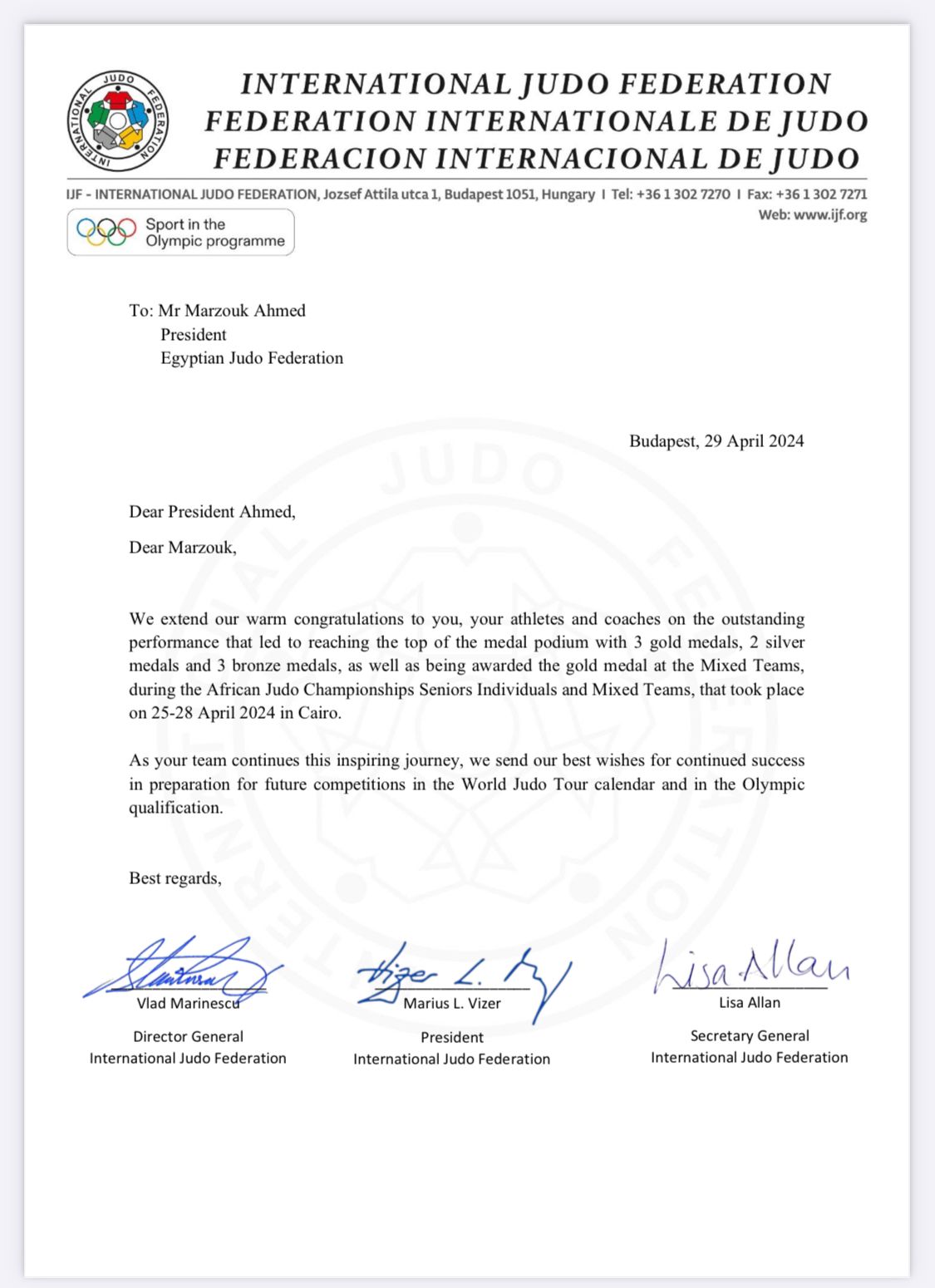 تلقى الاتحاد المصري للجودو برئاسة مرزوق علي، تهنئة نظيره الدولي بشأن تنظيم وحصد كأس البطولة الإفريقية للكبار، التي أقيمت خلال الفترة من 24 وحتى 28 أبريل الجاري على صالة رقم 1 بمجمع الصالات المغطاة في ستاد القاهرة.