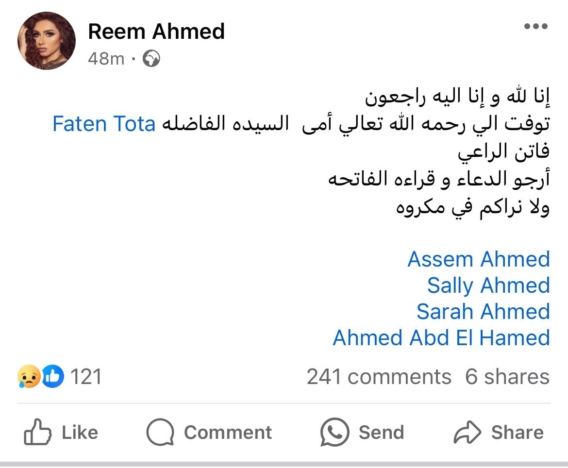 أعلنت الفنانة ريم أحمد عن وفاة والدتها السيدة فاتن الراعي.