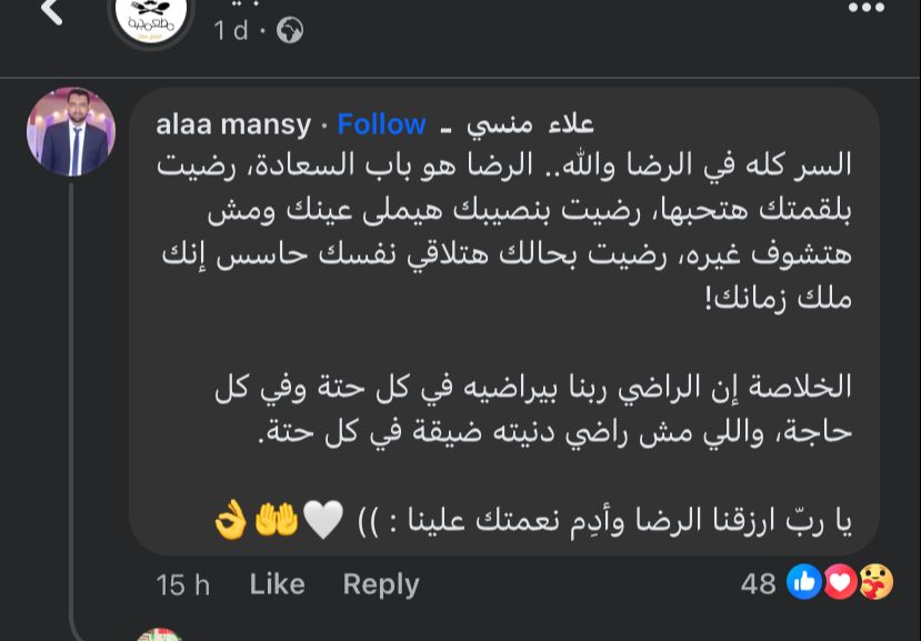 وقال صاحب حساب، معلقًا على صورة شابين طلبات، السر كله في الرضا والله.. الرضا هو باب السعادة، رضيت بلقمتك هتحبها، رضيت بنصيبك هيملى عينك ومش هتشوف غيره، رضيت بحالك هتلاقي نفسك حاسس إنك ملك زمانك، الخلاصة إن الراضي ربنا بيراضيه في كل حتة وفي كل حاجة، واللي مش راضي دنيته ضيقة في كل حتة.