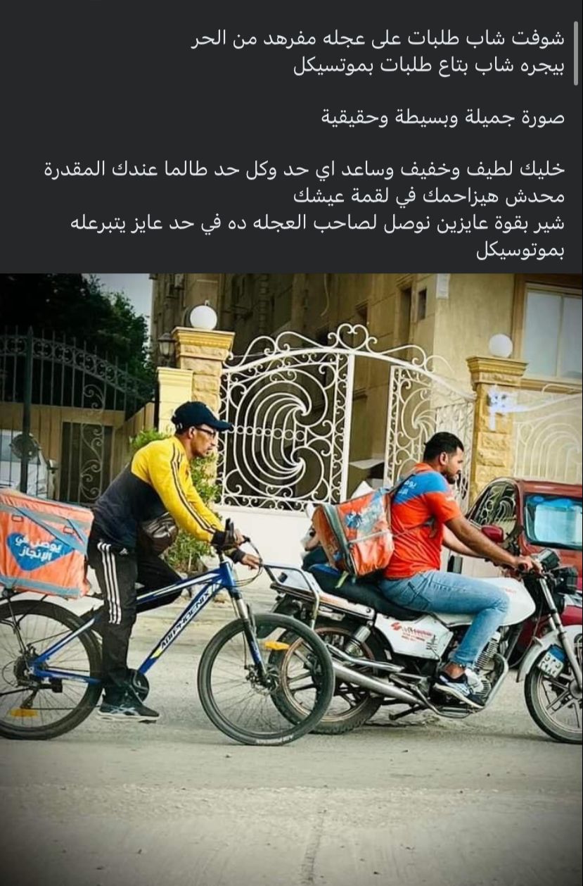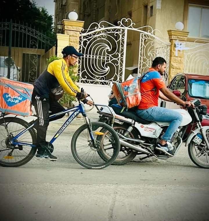 ونشر صاحب حساب، عبر موقع التواصل الإجتماعي فيسبوك، صورة شابين طلبات، وعلق عليها: شوفت شاب طلبات على عجلة مفرهد من الحر، بيجره شاب بتاع طلبات بموتسيكل.. صورة جميلة وبسيطة وحقيقية، خليك لطيف وخفيف وساعد أي حد وكل حد طالما عندك المقدرة، محدش هيزاحمك في لقمة عيشك، ومحتاجين نوصل لصاحب العجلة ده في حد عايز يتبرع له بموتوسيكل.