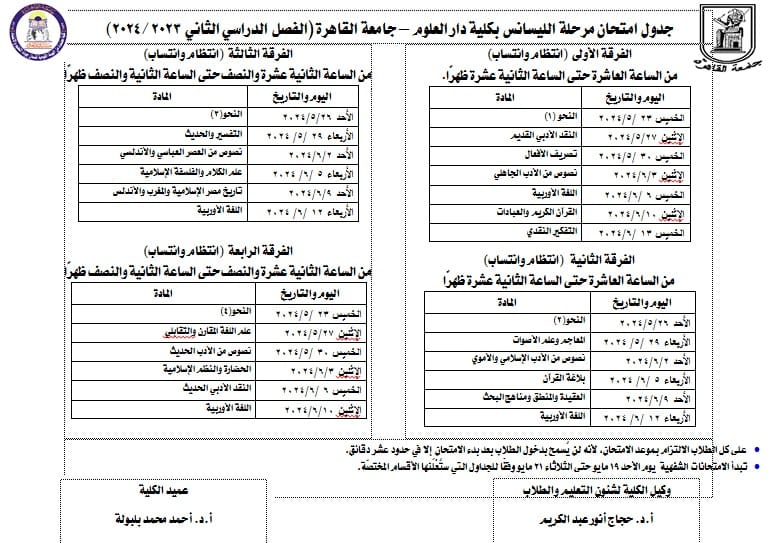 دار علوم القاهرة تعلن جداول امتحانات آخر العام 2024 لجميع الفرق الدراسية | صور