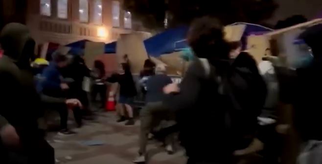 وأظهرت مقاطع فيديو لشهود عيان من جامعة كاليفورنيا، نقلتها رويترز، أشخاصًا يستخدمون العصي أو الأعمدة للطرق على ألواح خشبية تستخدم كحواجز مؤقتة لحماية المتظاهرين المؤيدين للفلسطينيين قبل استدعاء الشرطة إلى الحرم الجامعي.
