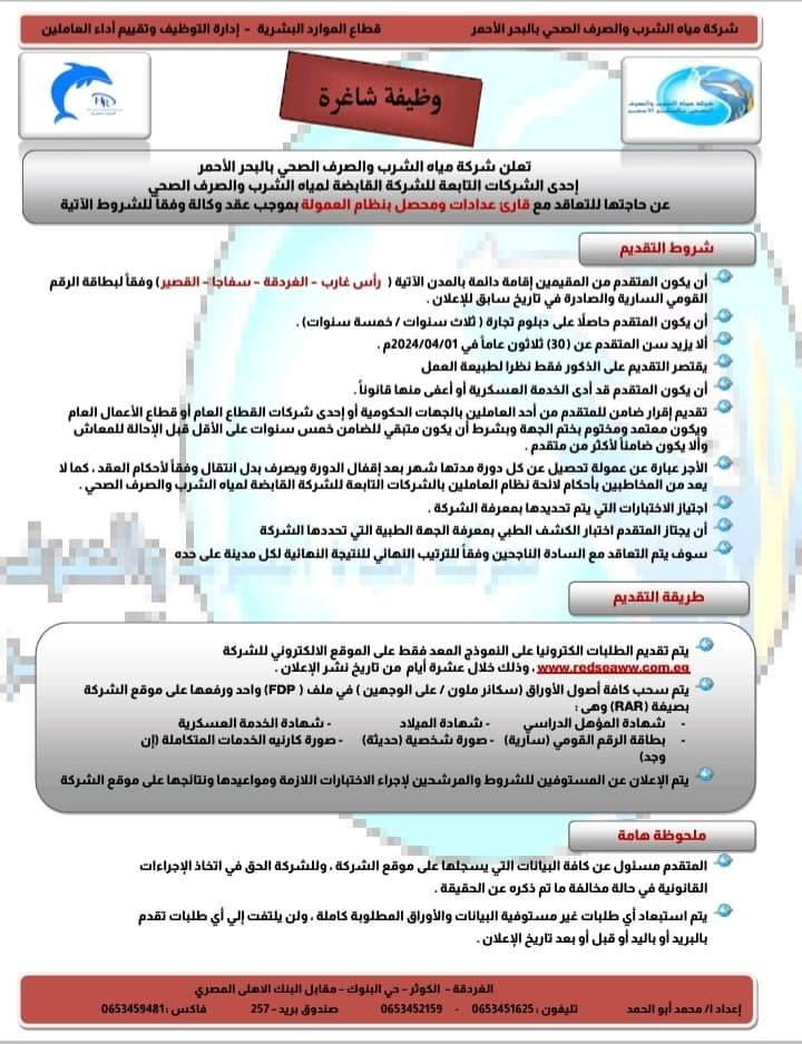 شروط وظائف شركة مياه الشرب البحر الأحمر