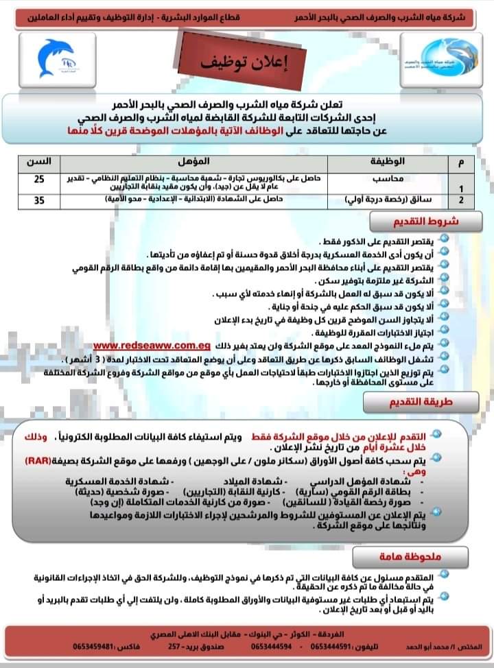 تتوفر مجموعة من وظائف شركة مياه الشرب البحر الأحمر جديدة متاحة للذكور بشروط محددة، وذلك للعمل بنظام التعاقد لمدة 3 أشهر قابلة للتجديد في وظائف مختلفة منها محاسب وسائق درجة أولى، ومحصل بنظام العمولة.
