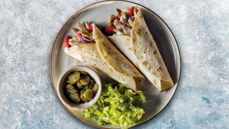 - ضع كمية مناسبة من الشاورما على الثومية ثم قطع من مخلل الخيار المقطع أصابع رقيقة، ولف الخبز بشكل اسطواني.