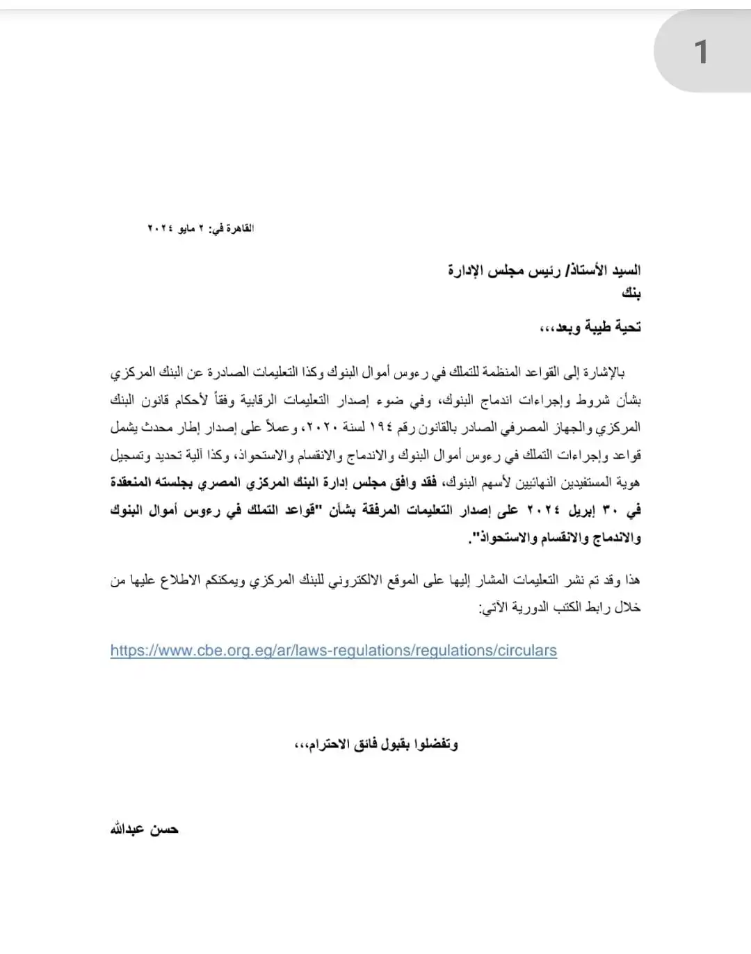 أعلن البنك المركزي المصري تعليمات جديدة بشأن قواعد التملك في رؤوس أموال البنوك والاندماج والانقسام والاستحواذ، وذلك في إطار سعي البنك المركزي لتعزيز الاستقرار المالي وضمان سلامة وصحة النظام المصرفي المصري.