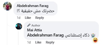 ذلك الأمر أثار اندهاش وتعجب كثير من مُتابعين منصة فيس بوك، حيث علق أحد المتابعين: حضرتك مش حقيقية؟.. ولكن لم تترك مي هذه الفرصة للتواصل مع المتابعين في التعليقات، وردت عليه: أنا ذكاء اصطناعي.. وعقب متابع آخر: لست أول مذيعة في الوطن العربي وسبقتك مذيعة أخرى في قناة مصرية، لترد عليه: استأذنتها أكون أول مذيعة بدالها.