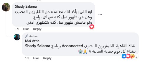 وتسائل مُتابع آخر: إيه اللي بيأكد إنك معتمدة من التلفزيون المصري.. وهل في ظهور قبل كده في أي برامج..ولو مفيش ظهور قبل كده هتظهري أمتى؟، وإجابته: برنامج connected قناة القاهرة، التليفزيون المصرى، بيتذاع كل يوم جمعة الساعة 8:00.
