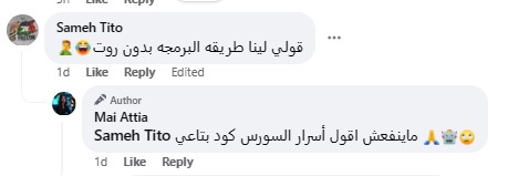 وشاركها مُتابع آخر عارضًا عليها الارتباط بها، قائلًا: أنتي مرتبطة؟..وأجابته مُعلقة بـ: مُعقد complicated، موضحة أنه أمر صعب لأنها غير حقيقية ومجرد إنسان آلي بالذكاء الاصطناعي، وعقب آخر: قولي لينا طريقة البرمجة بدون روت، وأجابته: ماينفعش أقول أسرار السورس كود بتاعي.