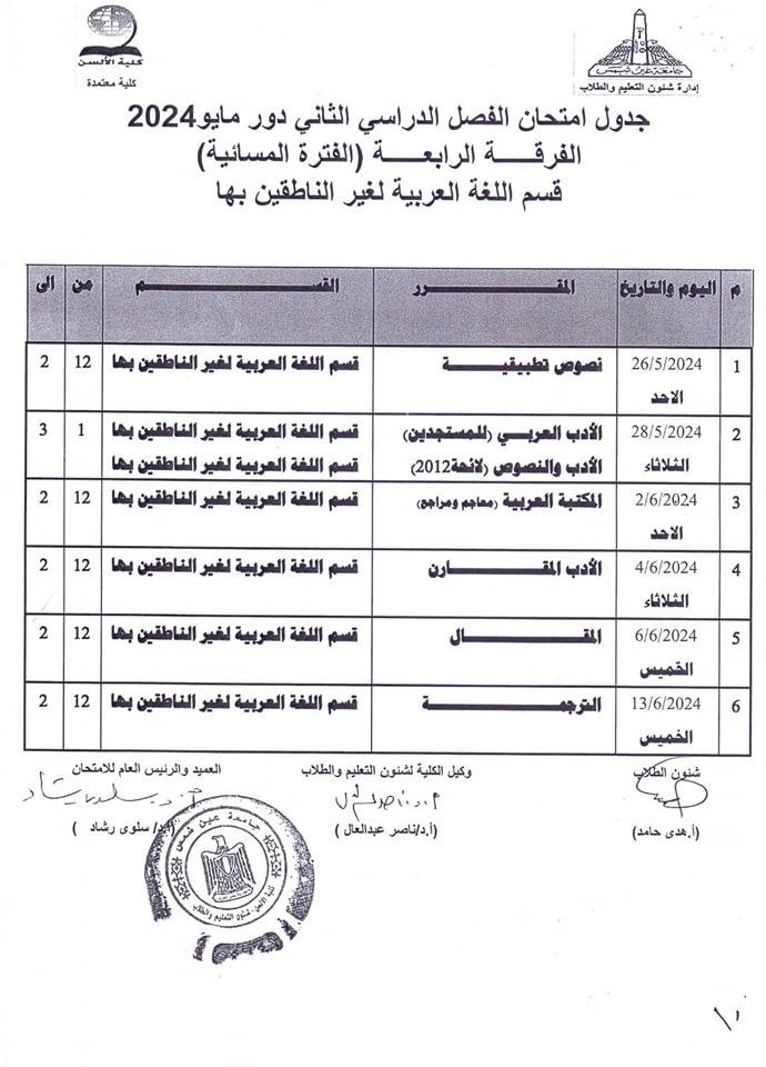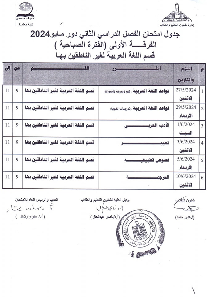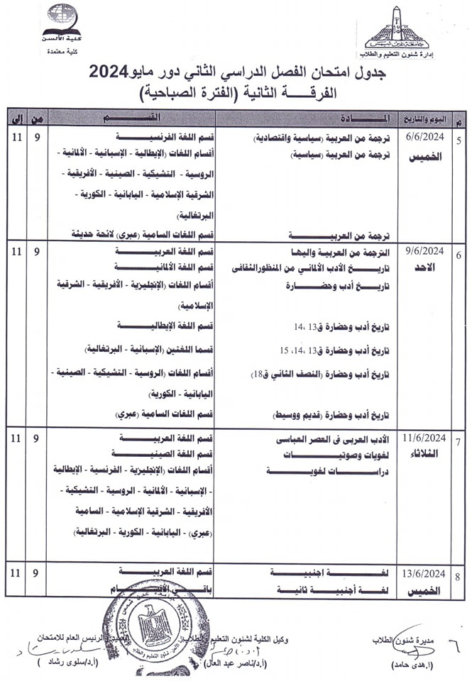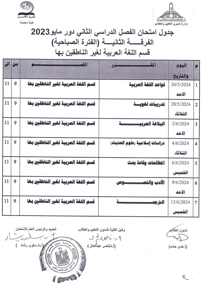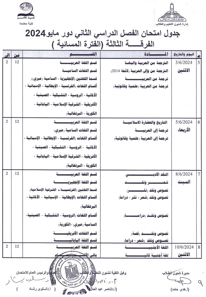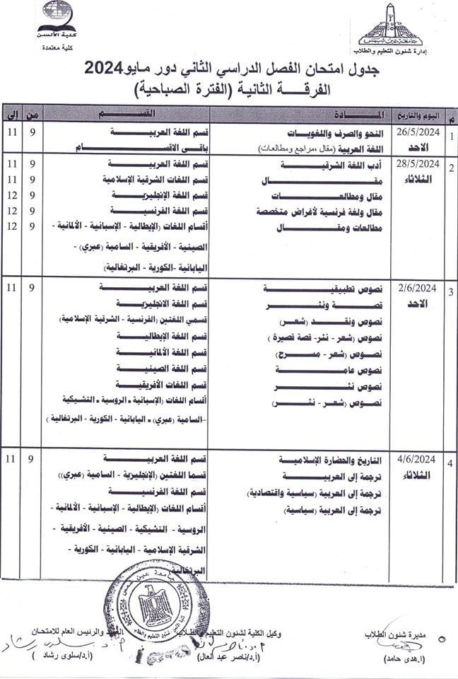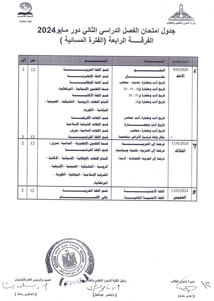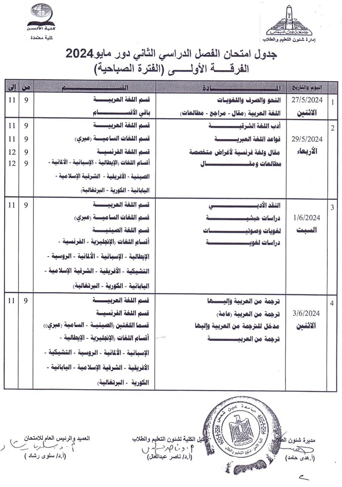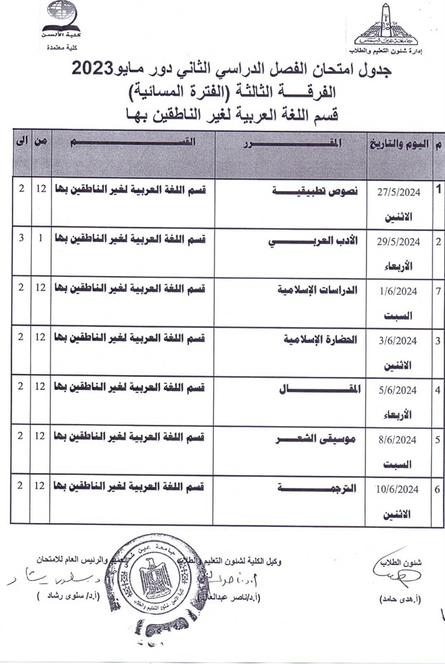 ويبحث الكثير من طلاب كلية الألسن بجامعة عين شمس، عن جدول امتحانات الفصل الدراسي الثاني 2024 حتى يكونوا على دراية به لكي يبدأوا مراجعة المقررات الدراسية بكل جدٍ واجتهاد من أجل الحصول على تقديرات مرتفعة.