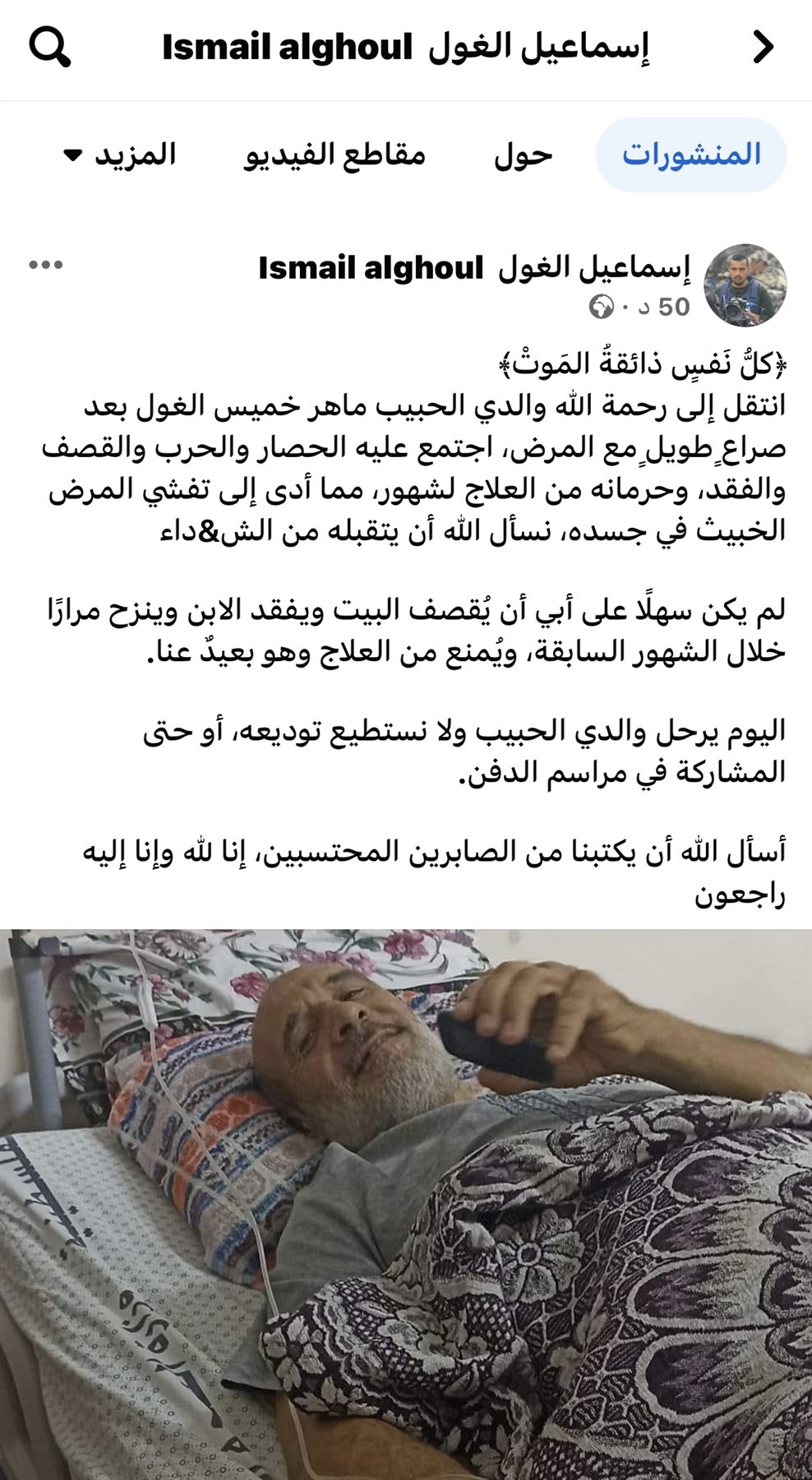 آلام لا تنتهي.. الصحفي الفلسطيني إسماعيل الغول يرثي وفاة والده من مستشفى بشمال سيناء: لم نستطيع وداعه ولا دفنه