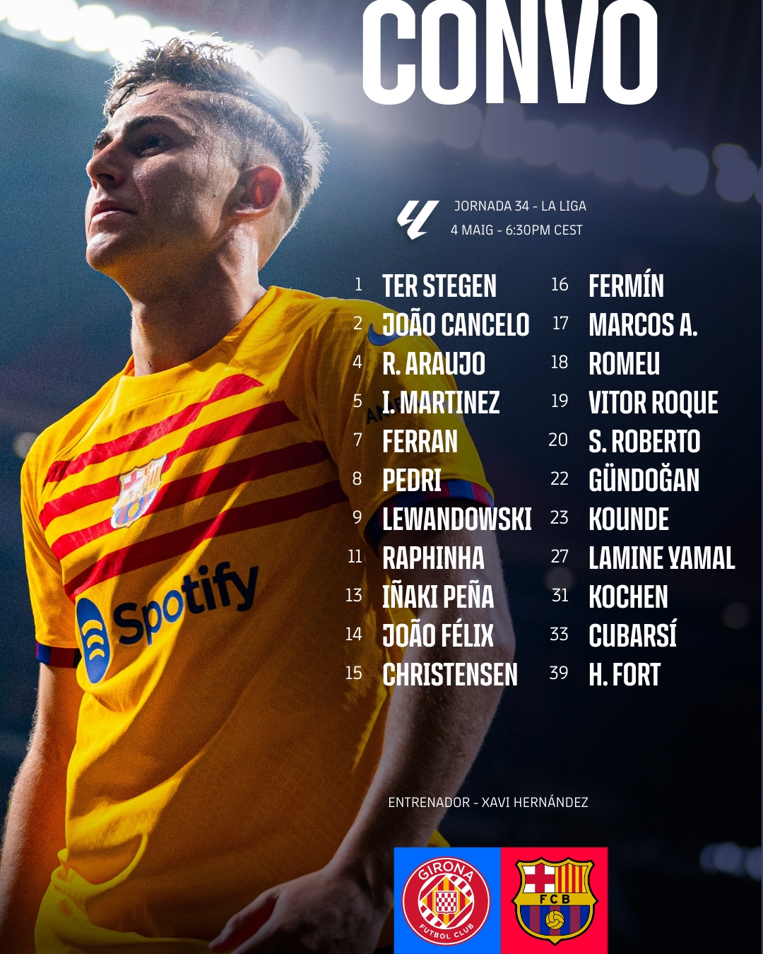 أعلن تشافي هيرنانديز المدير الفني للفريق الأول لكرة القدم بنادي برشلونة، قائمة لاعبيه لمواجهة جيرونا، اليوم السبت، ضمن منافسات الجولة الرابعة والثلاثين من مسابقة الدوري الإسباني.