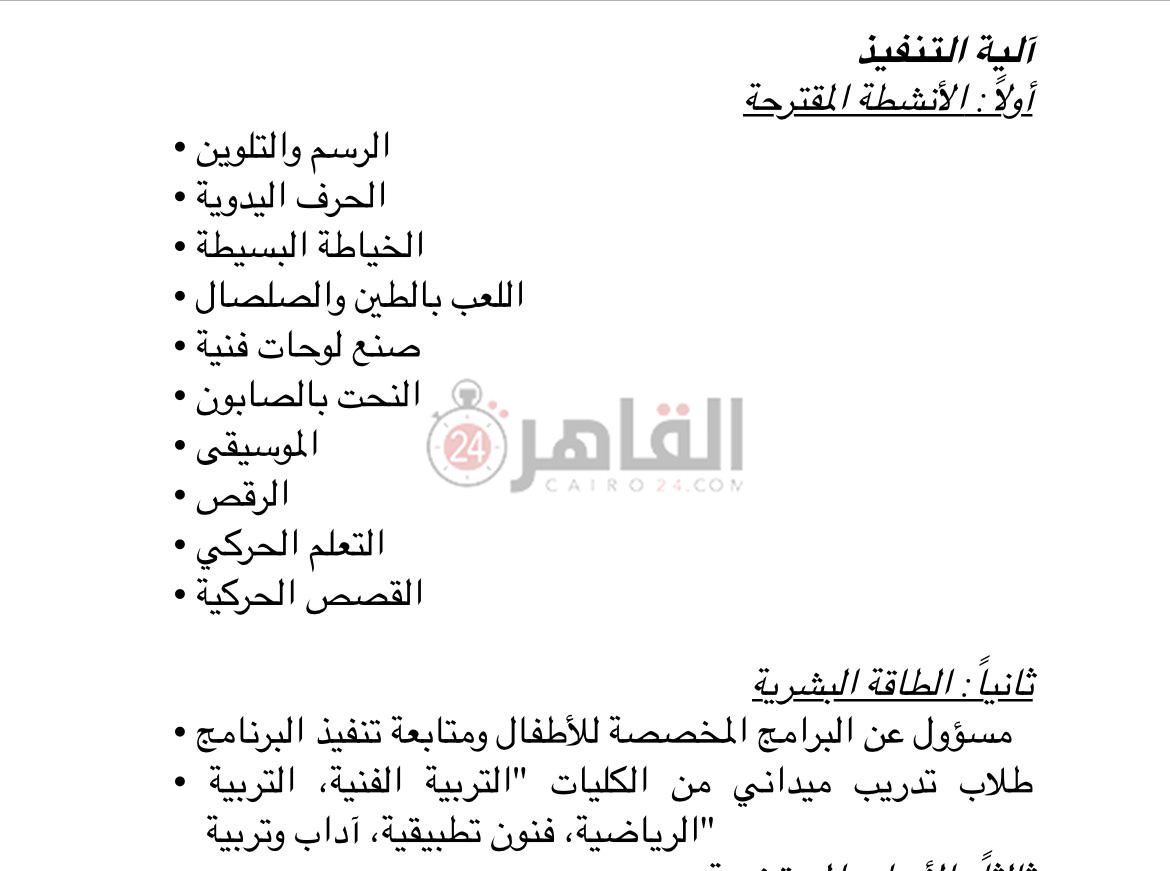 وواصل: من آليات التنفيذ هي الطاقة البشرية، وهذا يعتبر مسؤولا عن البرامج المخصصة للأطفال ومتابعة تنفيذ البرامج، كذا طلاب تدريب ميداني من الكليات التربية الفنية والتربية الرياضية، فنون تطبيقية وآداب وتربية، معقبًا: موعد الافتتاح ليس الآن، وفي حالة وجود أي شئ جديد سيتم الإعلان عنه.