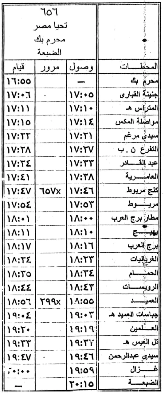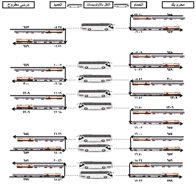 وأوضحت الهيئة القومية لسكك حديد مصر، أنه سيتم اختصار كافة القطارات المتجهة من محرم بك إلى مرسى مطروح بمحطة الحمام واختصار القطارات المتجهة من مرسى مطروح إلى محرم بك بمحطة العُميد، واختصار قطاري 648 و655 ركاب محرم بك / الضبعة ) بمحطة الحمام، وتعديل ميعاد قطار 656 ركاب - محرم بك / الضبعة كالجداول المرفقة، وتعديل ميعاد قطار 657 ركاب مرسى مطروح / محرم بك كالجداول المرفقة.