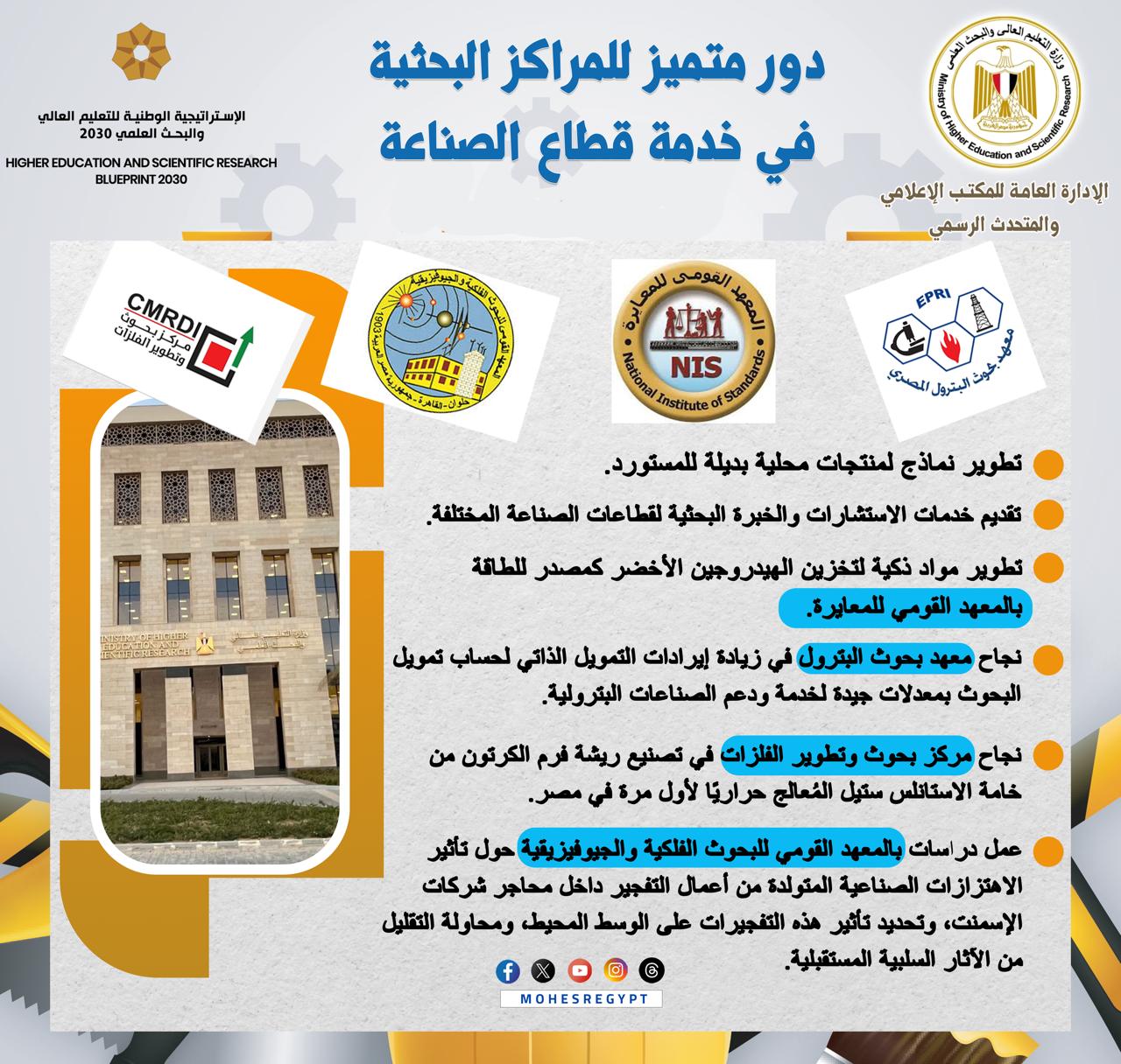 أكد الدكتور محمد أيمن عاشور وزير التعليم العالي والبحث العلمي، على الدور الحيوي للبحث العلمي في خدمة قطاع الصناعة، مشيرًا إلى أن الجهود التي قامت بها المراكز البحثية التابعة للوزارة في توجيه البحوث العلمية لخدمة أهداف الصناعة، قد حققت العديد من النتائج المتميزة التي ساهمت في دعم الصناعات وتوفير بدائل محلية، لافتًا إلى أن ربط البحث العلمي بمتطلبات التنمية يأتي على رأس أولويات العمل للوزارة في إطار تنفيذ الاستراتيجية الوطنية للتعليم العالي والبحث العلمي التي أطلقتها الوزارة.