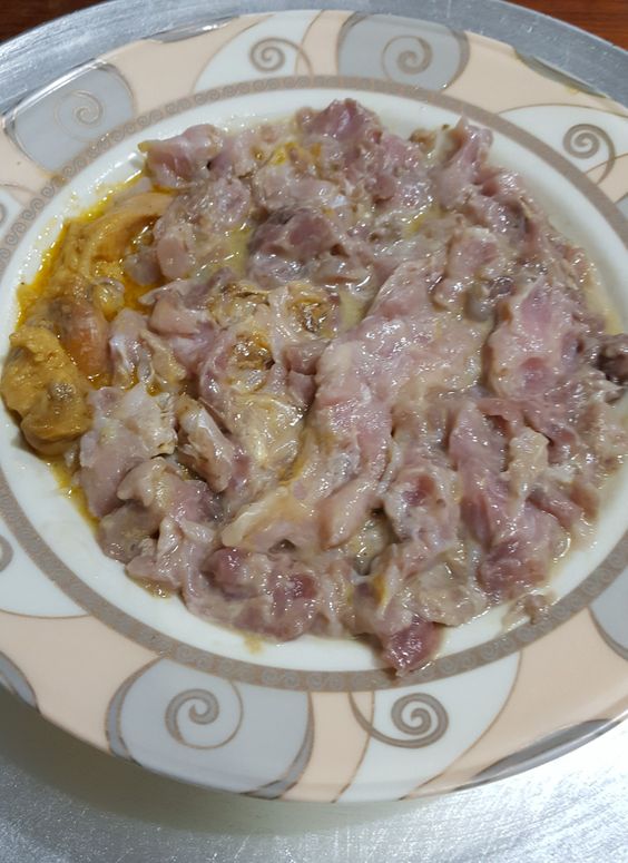 - يقطع الفسيخ مكعبات صغيرة بالسكينة ويوضع في بولة كبيرة.