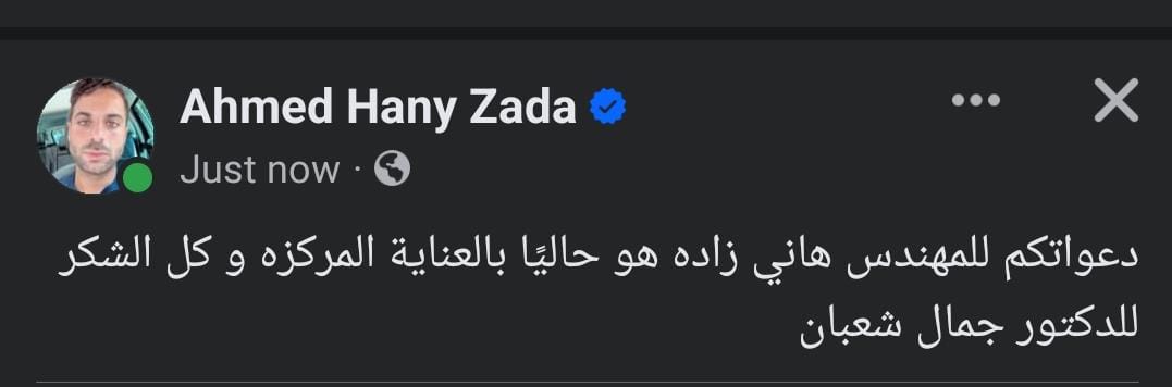 وقال أحمد هاني زادة، نجل المهندس هاني زادة، عبر حسابه على موقع التواصل الاجتماعي فيسبوك: دعواتكم للمهندس هاني زادة، هو حاليًا بالعناية المركزة، وكل الشكر للدكتور جمال شعبان.