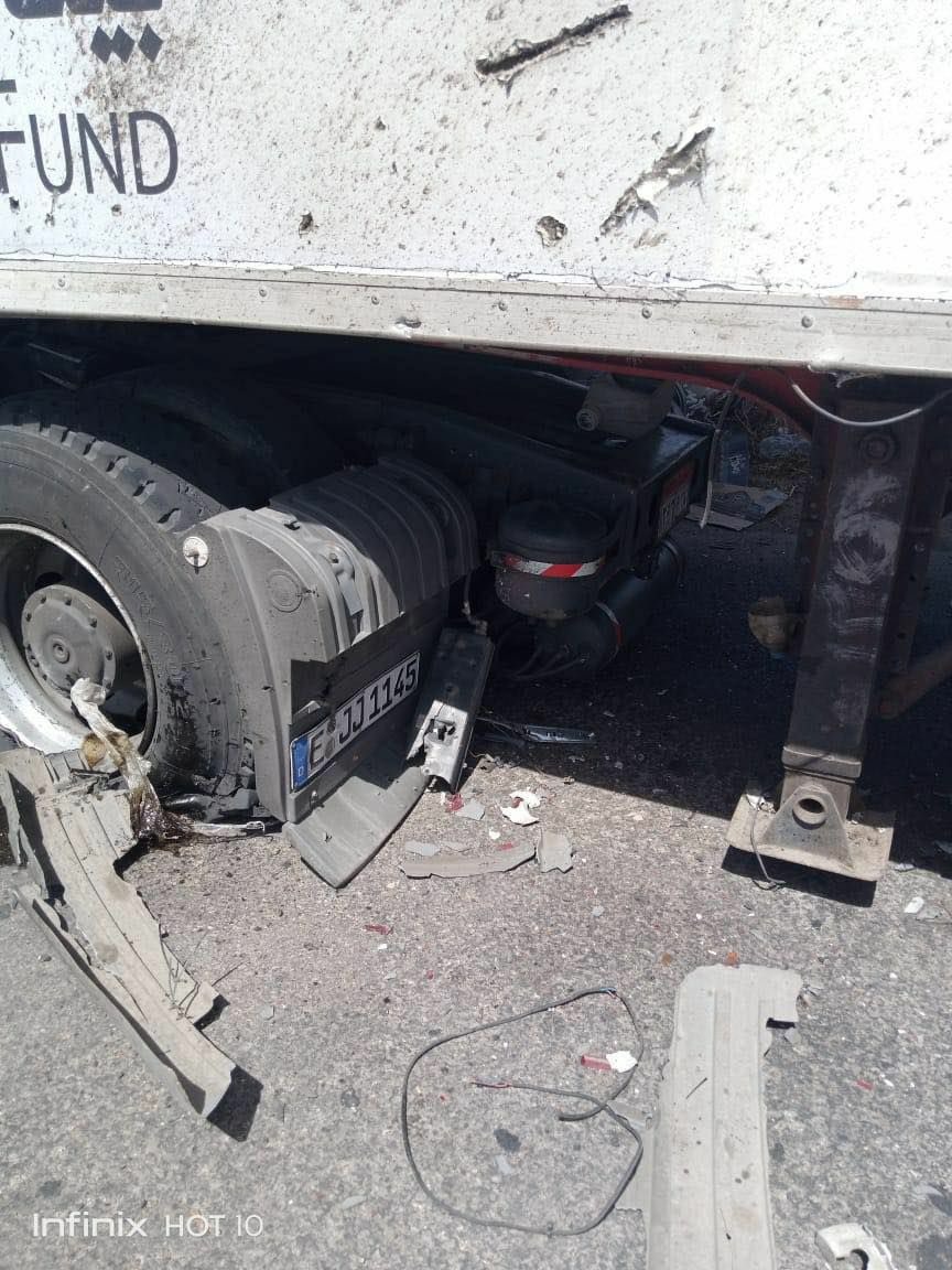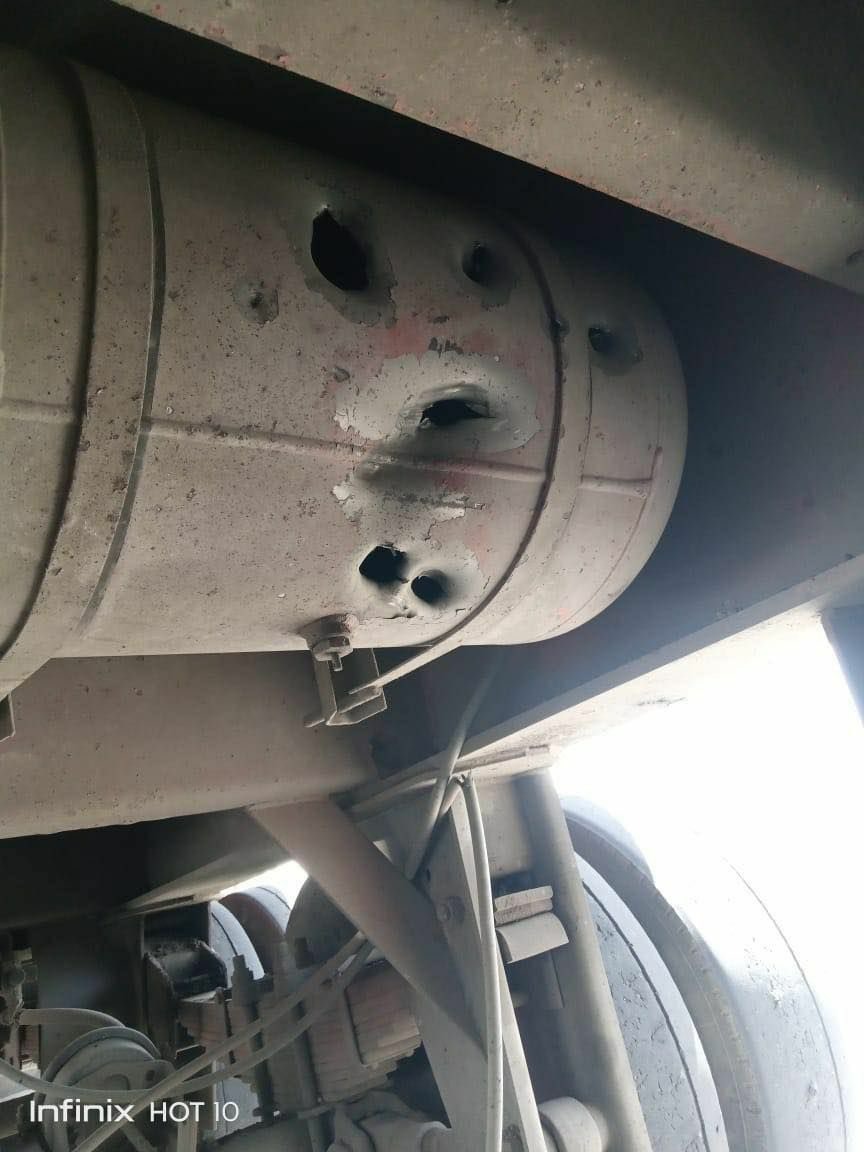 وأظهرت صور تضرر عدد من الشاحنات جراء القصف.