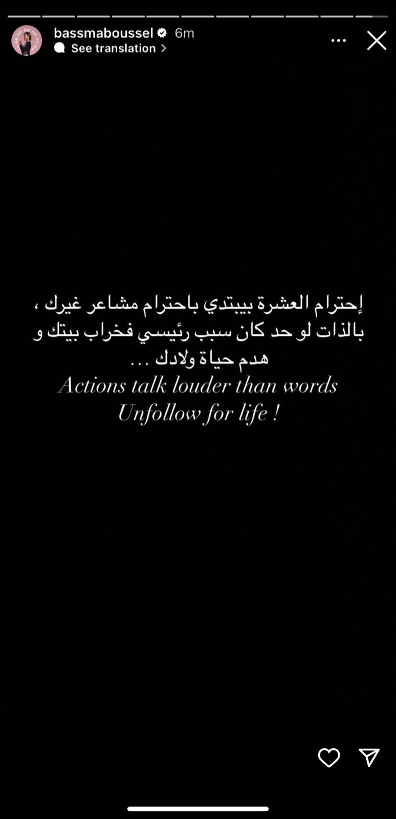 وبعد شهر من انفصال تامر حسني وبسمة بوسيل، خرجت الأخيرة عن صمتها، وهاجمت مسؤولة السوشيال ميديا لـ تامر حسني، في أثناء احتفالها بحفل زفافها، ونشرت بسمة عبر حسابها على إنستجرام، قائلة: حسبي الله ونعم الوكيل فيكي يا هالة، أنت سبب في خراب البيت.. احترام العشرة بيبتدي باحترام مشاعر غيرك.. بالذات لو حد كان سبب رئيسي في خراب بيتك وهدم حياة ولادك.