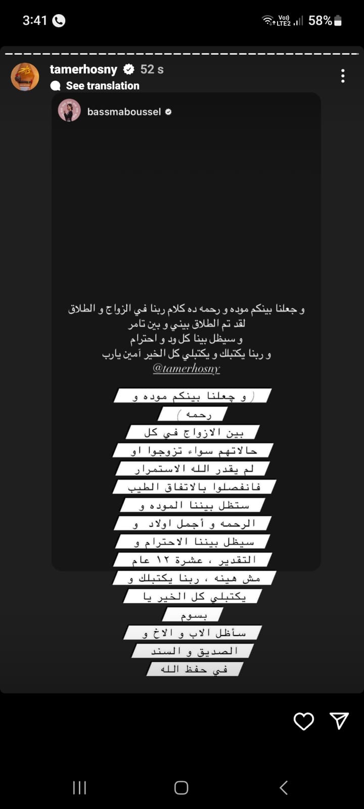 في 27 أبريل عام 2023، أعلنت بسمة بوسيل عبر استوري حسابها على موقع تبادل الصور والفيديوهات انستجرام، انفصالها عن تامر حسني، إذ كتبت: وجعلنا بينكم مودة ورحمة، دا كلام ربنا في الزواج والطلاق لقد تم الطلاق بيني وبين تامر حسني، وبدوره، علقت تامر حسني قائلا: وجعلنا بينكم مودة ورحمة، دا كلام ربنا في الزواج والطلاق وتم الطلاق بيني وبين بسمة بوسيل وسيظل بيننا كل ود واحترام وربنا يكتبلك ويكتبلي كل خير، وعشرة 12 سنة مش قليل يا بسوم وسأظل الاب والاخ والصديق والسند.. في حفظ الله.