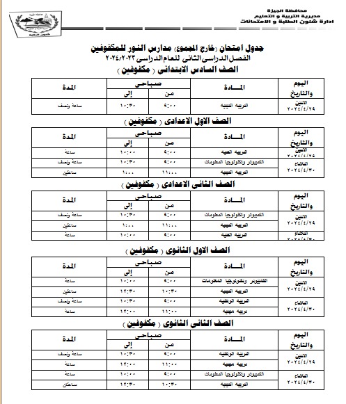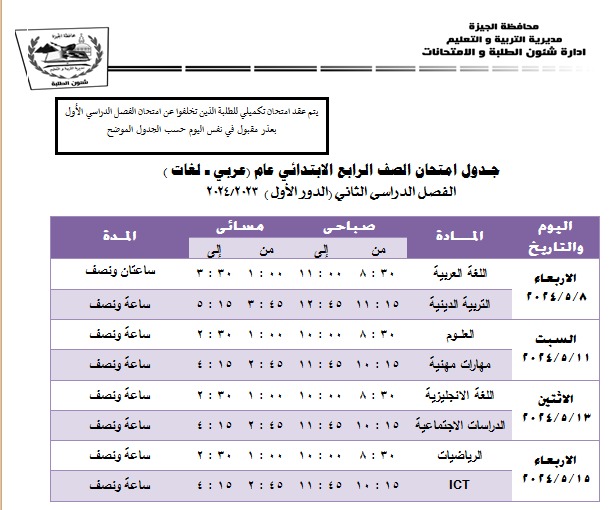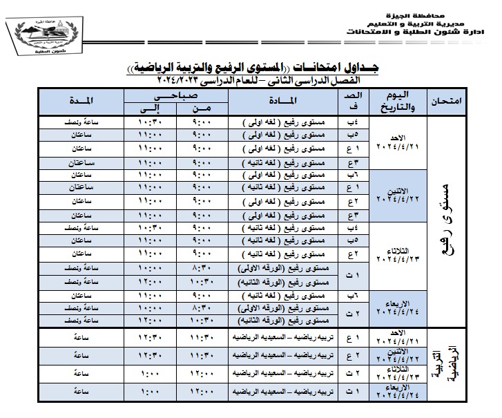 جاءت جداول امتحانات الفصل الدراسي الثاني لطلاب مدارس الجيزة وفقا لما أعلنته مديرية التربية والتعليم بمحافظة الجيزة كالآتي:
