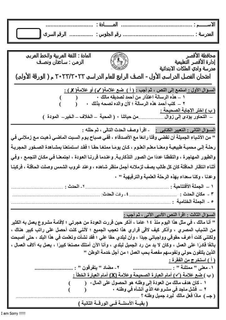 نماذج امتحانات لغة عربية للصف الرابع الابتدائي ترم ثاني pdf