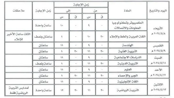 بينما يوم السبت 11 مايو 2024، يؤدي الطلاب امتحان الدراسات الاجتماعية، وكذلك التربية الفنية، أما يوم الأحد 12 مايو 2024، سوف يؤدي الطلاب امتحان الجبر والإحصاء، وكذلك مادة اللغة الإنجليزية، وهناك يوم الاثنين 13 مايو 2024، يؤدي الطلاب امتحان مادة التربية الرياضية.