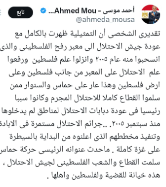 علق الإعلامي أحمد موسى على استيلاء الجيش الإسرائيلي على معبر رفح من الجانب الفلسطيني قائلًا: تقديري الشخصي أن التمثيلية ظهرت بالكامل مع عودة جيش الاحتلال الى معبر رفح الفلسطيني والذي انسحبوا منه عام 2005 وانزلوا علم فلسطين ورفعوا علم الاحتلال على المعبر من جانب فلسطين وعلى أرض فلسطين، وتابع: وهذا عار على حماس والسنوار ممن سلموا القطاع كاملا للاحتلال المجرم، وكانوا سببا رئيسيا في عودة دبابات الاحتلال لمناطق لم يدخلوها منذ سبتمبر 2005