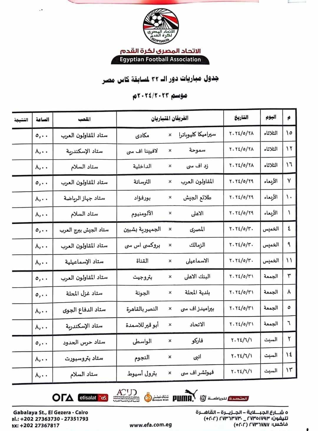 الأهلي يواجه الألومنيوم يوم 29 مايو على ستاد السلام، والزمالك يواجه بروكسي يوم 30 مايو على ستاد المقاولون العرب في دور الـ 32 من كأس مصر.