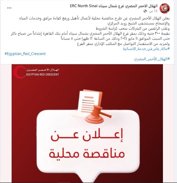 وقالت جمعية الهلال الأحمر المصري، في منشور لها عبر صفحتها الرسمية بموقع التواصل الاجتماعي فيسبوك: يعلن الهلال الأحمر المصري عن طرح مناقصة محلية لأعمال تأهيل ورفع كفاءة مرافق وخدمات المياه والإصحاح بمستشفى الشيخ زويد المركزي وعلى الراغبين من الشركات سحب كراسة الشروط بقيمة 300 جنيه وذلك بمقر فرع الهلال الأحمر المصري بشمال سيناء أمام بنك القاهرة ابتداء من صباح باكر حتى السبت الموافق 11 مايو 2024، وذلك من الساعة 12 ظهرا حتى 5 مساءً، ولمزيد من الاستفسار التواصل مع المكتب الإداري بمقر الفرع.