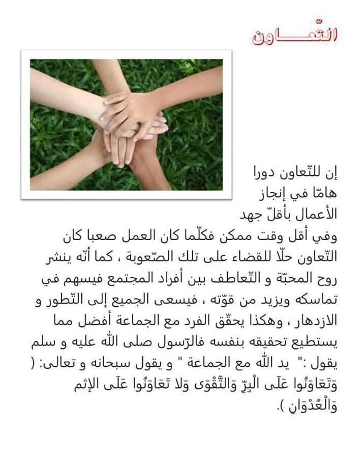 لذلك فالتعاون وقود النجاح في كل مجالات الحياة، منذ أن نبدأ أولى مراحل النمو وحتى نبلغ من العمر عتيًا، سنظل نتعاون من أجل أن نعيش جميًعا، وتقول الحكمة "اليد الواحدة لا تصفق" كذلك الإنسان بمفرده لن يستطيع النجاح في أي أمر من أمور حياته، وواجبنا أن نحث على التعاون بين الناس وأن نحمد الله على نعمة التعاون فبها تتقدم الأمم ونختم بقول الشاعر أحمد شوقي: