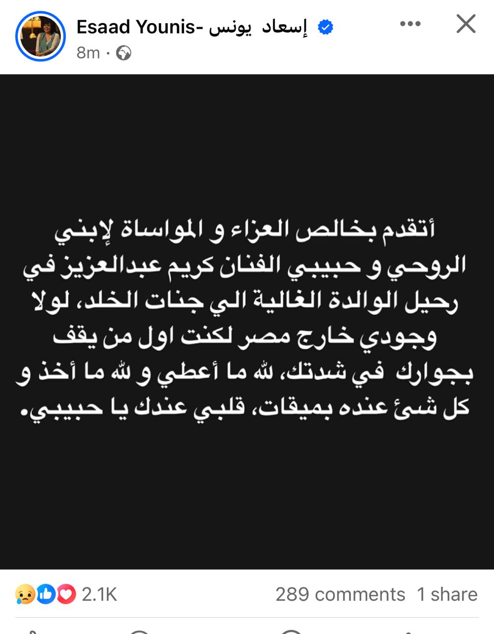وقالت الفنانة إسعاد يونس عبر حسابها الرسمي على موقع فيسبوك: أتقدم بخالص العزاء والمواساة لابني الروحي وحبيبي الفنان كريم عبد العزيز في رحيل والدته الغالية.. إلى جنة الخلد.. لولا وجودي خارج مصر لكنت أول من يقف بجوارك في شدتك.. لله ما أعطى ولله ما أخذ وكل شيء عنده بميقات.. قلبي عندك يا حبيبي.