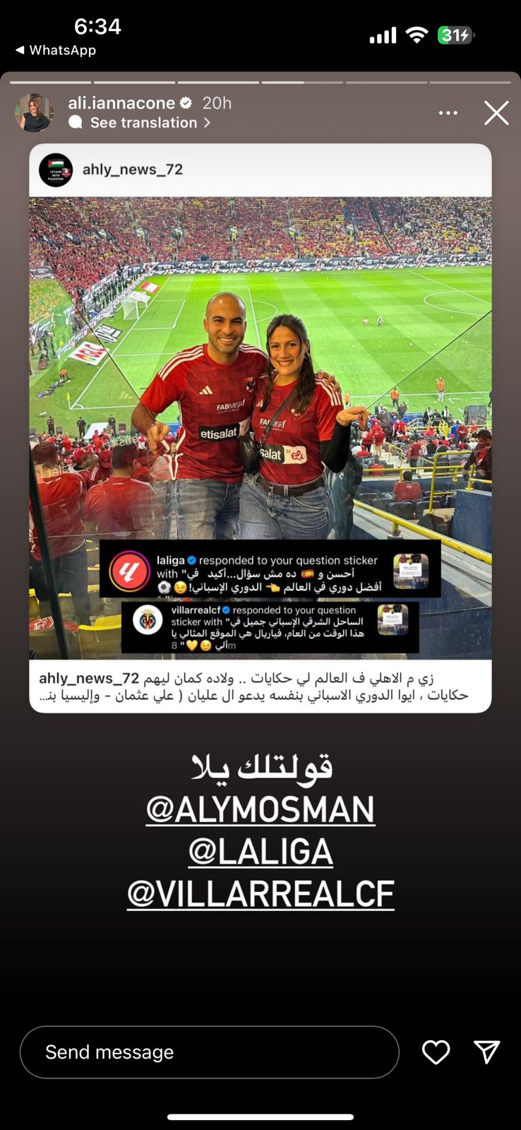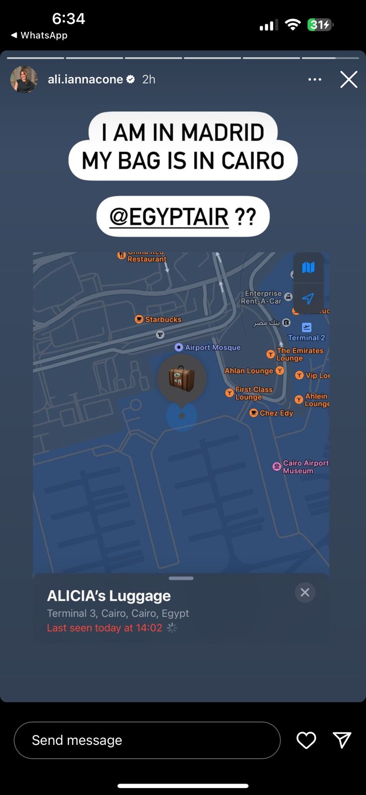 وكتبت إليسيا يانكون ابنة مدرب حراس النادي الأهلي: أنا في مدريد وشنطي في القاهرة، وقامت بالإشارة لحساب شركة مصر للطيران عبر إنتسجرام.