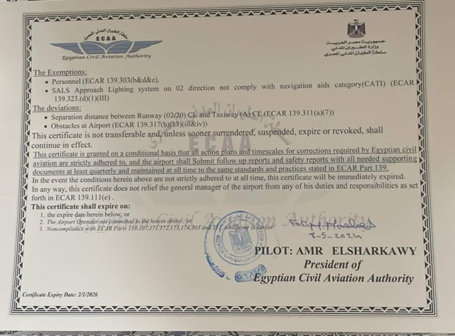 مطار الأقصر الدولي يحصل على شهادة تجديد الترخيص حتى 2026 | صور