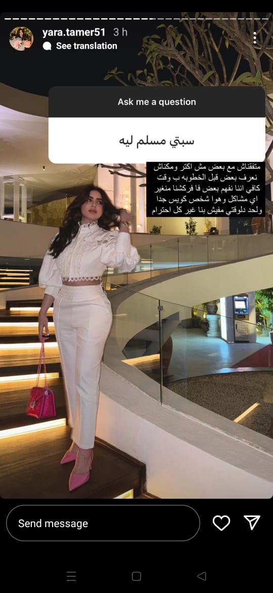 وكتبت يارا عبر ستوري حسابها بموقع إنستجرام ردًا على سؤال متابعة: متفقناش مع بعض مش أكتر ومكناش نعرف بعض قبل الخطوبة بوقت كافي إننا نفهم بعض، ففركشنا من غير أي مشاكل وهو شخص كويس جدًا ولحد دلوقتي مفيش بينا غير كل احترام.