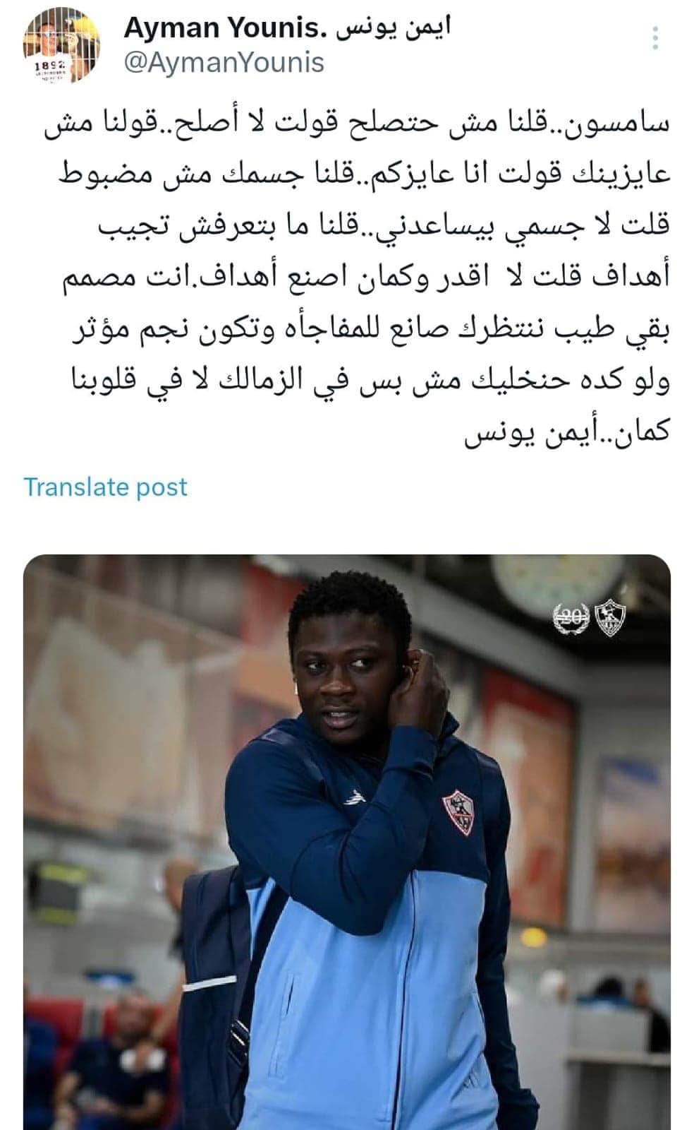 وكتب أيمن يونس عبر حسابه الرسمي على موقع إكس: سامسون قولنا مش هتصلح قولت لا أصلح، قولنا مش عايزينك، قولت أنا عايزكم.