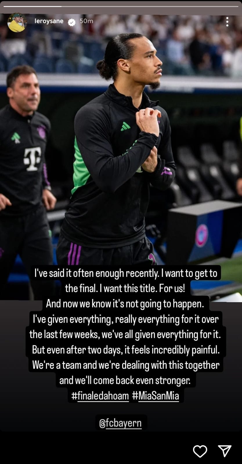 وكتب ليروي ساني عبر ستوري الخاص به بموقع التواصل الاجتماعي إنستجرام: لقد قلت ذلك كثيرًا مؤخرًا أريد أن أصل إلى النهائي، أريد هذا اللقب.