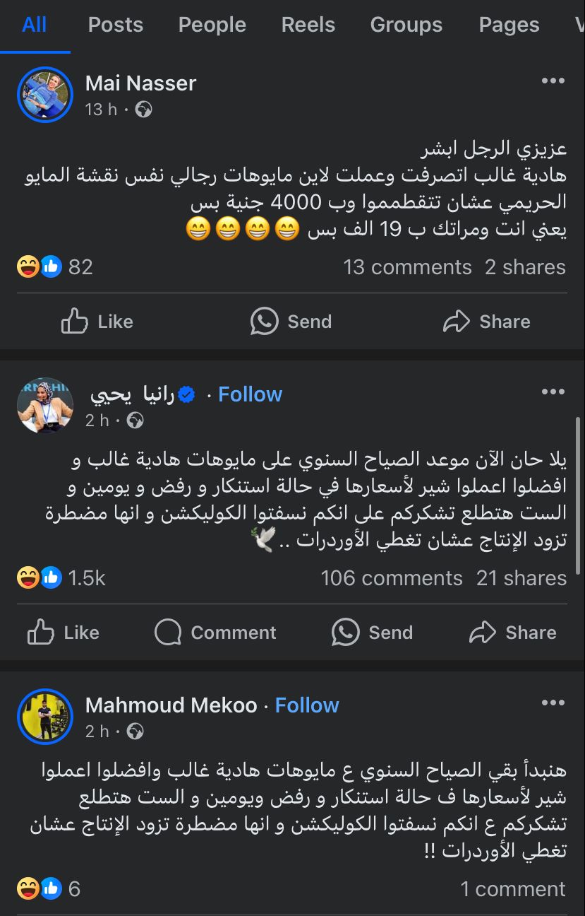 مما تصدر الترند عبر صفحات مستخدمي منصات فيسبوك وإكس، خاصًة بعد الكشف عن أسعار التصميمات الحديثة لـ مايوهات هادية غالب بموسم الصيف 2024، والتي تتراوح أسعارها من 13،972حتى 14،972 ألف جنيه، والتي أثارت الجدل المعتاد بين الفتيات والسيدات عبر المواقع.