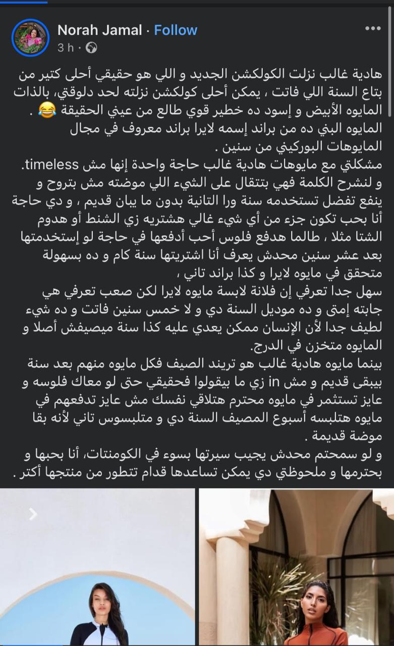 وشاركت أخرى: خناقة هادية غالب بدأت بدري قوي السنة دي بجد، ونفسي الناس تفهم أن هادية غالب بتستهدف طبقة معينة من الناس ودي مش طبقية منها ده طبيعي في أي بزنس والطبقة دي بالنسبالها 14 ألف في مايوه ده كويس، محدش يتهم هادية غالب بالغباء إنها منزلة مايوه بالسعر ده.. مايوه هادية غالب ده مش مايوه محجبات والبوركيني مش حكر على المحجبات، عشان كده فنانات كتير اشتروه السنة اللي فاتت ولبسوه وهما مش محجبات، هدوا أعصابكم كده زي ما في مايوه بـ 14 ألف لسة في مايوهات ب 200 جنيه عادي.