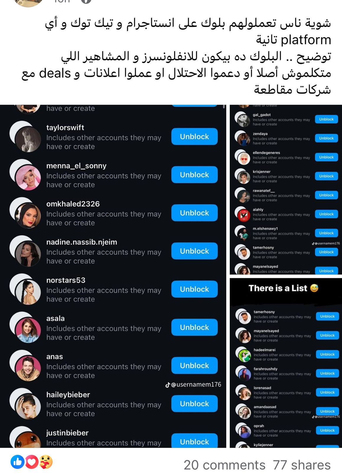 وقام عدد كبير بإلغاء متابعة عدد كبير من البلورجز والمشاهير والفنانين سواء كانوا في الوطن العربي أو في الغرب، وذلك اعتراضًا على موقفهم من القضية الفلسطينية.