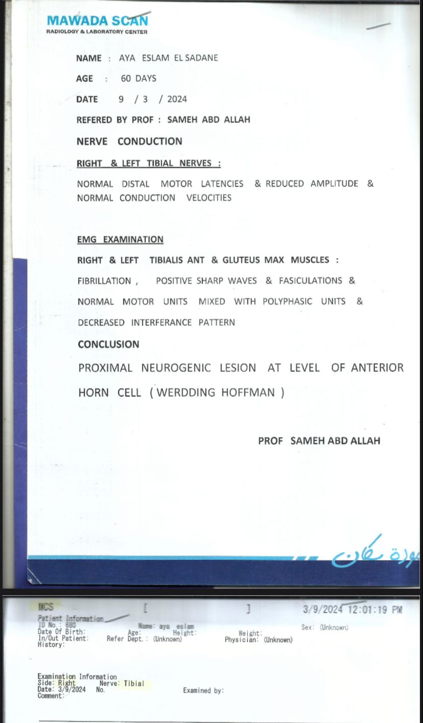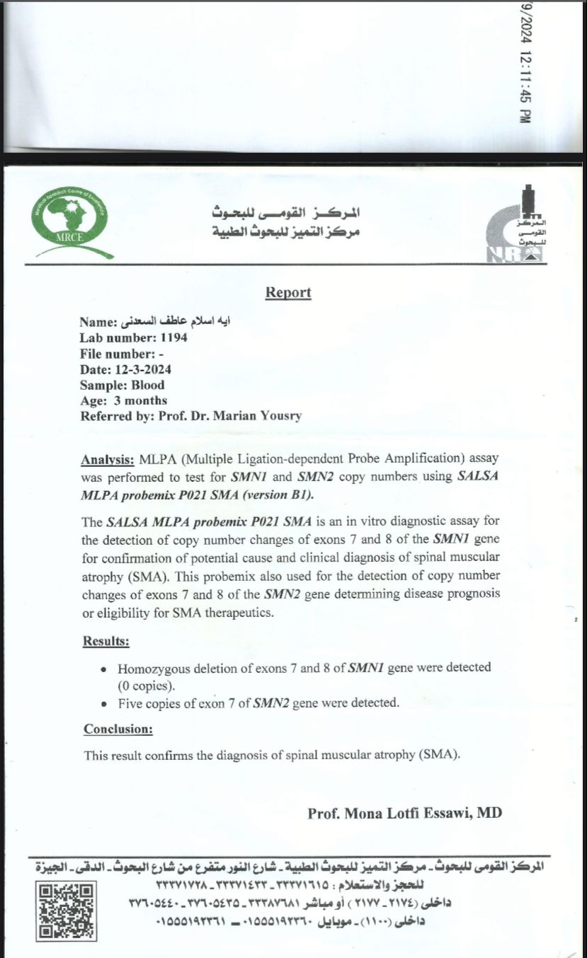 واستغاثت إسراء أشرف، والدة الطفلة آية إسلام سعد، من قرية كفر جنزور التابعة لـ مركز تلا بمحافظة المنوفية، لـ علاج ابنتها آية تحتاج لعلاج مرض ضمور العضلات الشوكي قبل بلوغها عمر الـ 6 أشهر، وخاصة أن الأطباء أخبروها بضرورة العلاج ومدى فاعليته في الأشهر الأولى من العمر.