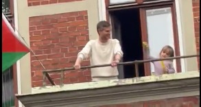 بل ظهر في الفيديو رجل يقف بجوار ابنه، وهو يلوح بعلم فلسطين ولم يتضح إذا كان هذا الرجل ملك الدنمارك أم لا.