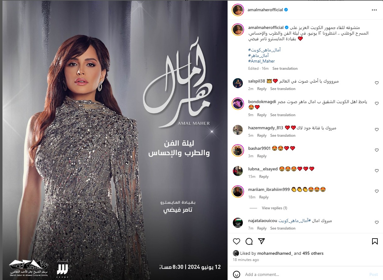 وأعلنت آمال ماهر عبر حسابها الشخصي على موقع تبادل الصور والفيديوهات إنستجرام، عن إحيائها حفلا غنائيا في دولة الكويت، إذ كتبت: متشوقة للقاء جمهور الكويت العزيز على المسرح الوطني، انتظرونا يوم 12 يونيو، في ليلة الفن والطرب والإحساس، بقيادة المايسترو تامر فيضي.