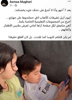 وبعد مرور 7 أشهر على وفاة أطفالها، وصفت الأم شعورها بعد وفاة أطفالها قائلة: بعد 7 أشهر وأنا لا أجرؤ على حذف شيء يخصكما، اليوم أزيل تطبيقات الألعاب التي حملتموها على جهازي، أخرج من المجموعات التعليمية الخاصة بكما.
