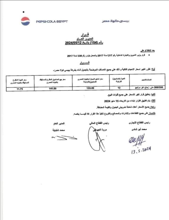 ويبدأ تطبيق الزيادة الجديدة على أسعار زجاجة بيبسي كولا غير مرتجع بدءًا من غد الأربعاء الموافق 15 مايو 2024، وذلك وفقا للقرار المرسل من الشركة لشعبة المواد الغذائية بالغرف التجارية.