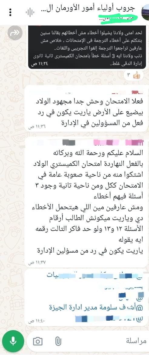 اشتكى العديد من أولياء أمور طلاب الصف الثاني الثانوي إدارة الدقي بمحافظة الجيزة، من امتحان الكيمياء اليوم الثلاثاء، حيث عبر أولياء الأمور على الجروب الخاص بهم بصعوبة الامتحان وتواجد بالامتحان 3 أسئلة خطأ.