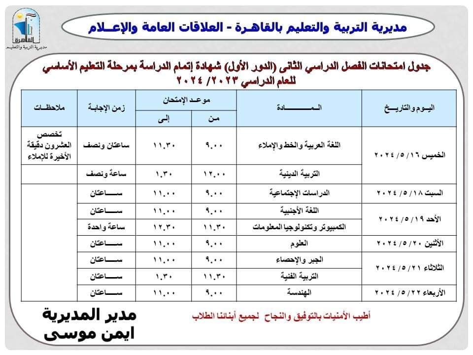 وجاء جدول امتحانات الشهادة الإعدادية الترم الثاني بمحافظة القاهرة للعام الدراسي الحالي 2023-2024 كالاتي:-
