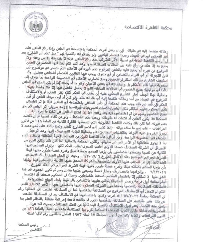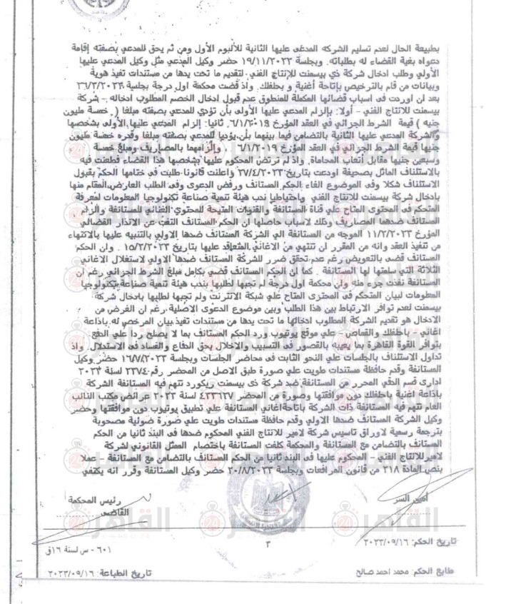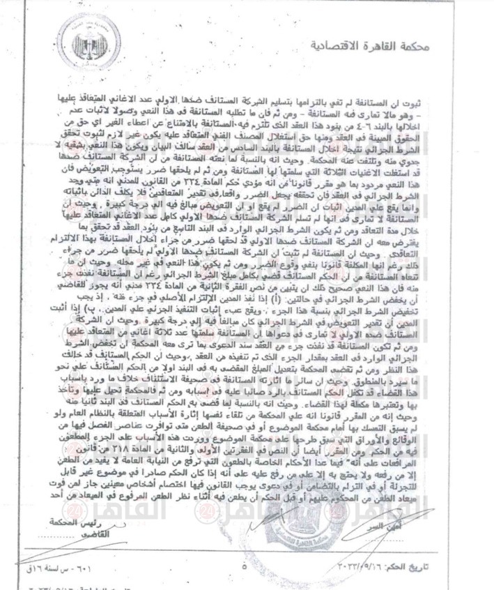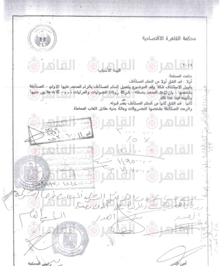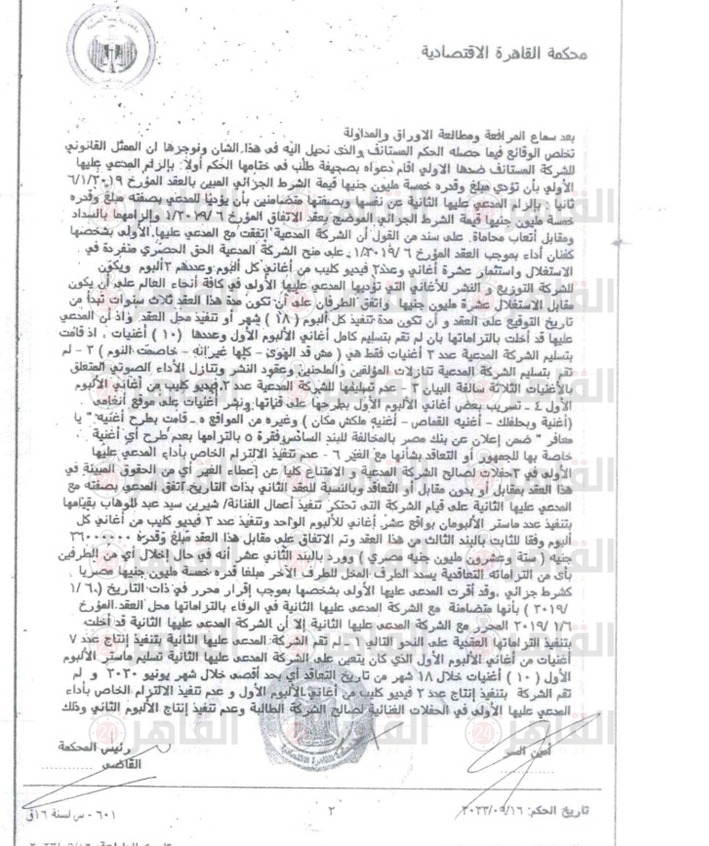 وحصل القاهرة 24 على مستندات من حكم الاقتصادية، والتي أكدت انتهاء عقد الفنانة شيرين عبد الوهاب مع شركة روتانا للصوتيات والمرئيات.