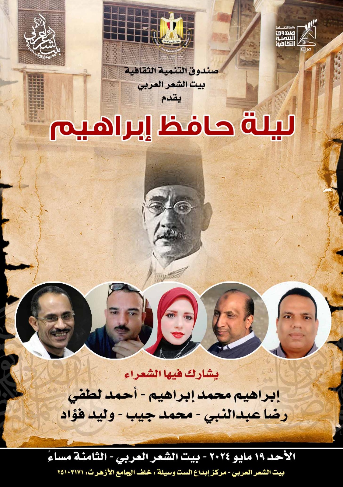 تحمل الأمسية اسم ليلة حافظ إبراهيم، إحياء لذكرى الشاعر الكبير التي تحل في شهر 21 يونيو المقبل، ويشارك في الأمسية الشعراء: إبراهيم محمد إبراهيم، وأحمد لطفي، ورضا عبد النبي، ومحمد جيب، ووليد فؤاد.