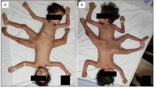 بينما كان لدى الطفلين أطراف علوية فعالة، كانت جذوعهما ملتحمة ببعضها البعض عند الحوض، ويتشاركان في ثلاثة أرجل وقضيب واحد وفتحة شرج.